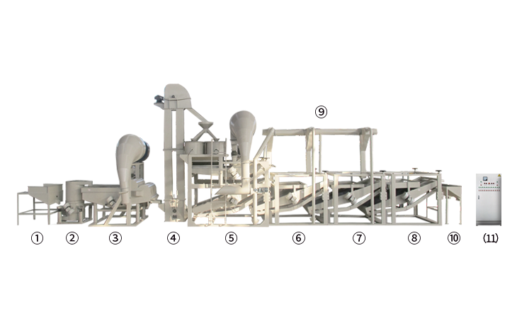 ① 上料斗② 原料提升機(jī) ③ 多功能除雜機(jī) ④ 斗式提升機(jī) ⑤ 脫殼、風(fēng)選、分選主機(jī) ⑥ 籽仁復(fù)選機(jī)1 ⑦ 籽仁復(fù)選機(jī)2 ⑧ 籽仁復(fù)選機(jī)3 ⑨ 風(fēng)力回料系統(tǒng) ⑩ 接料斗 (11) 電氣控制柜